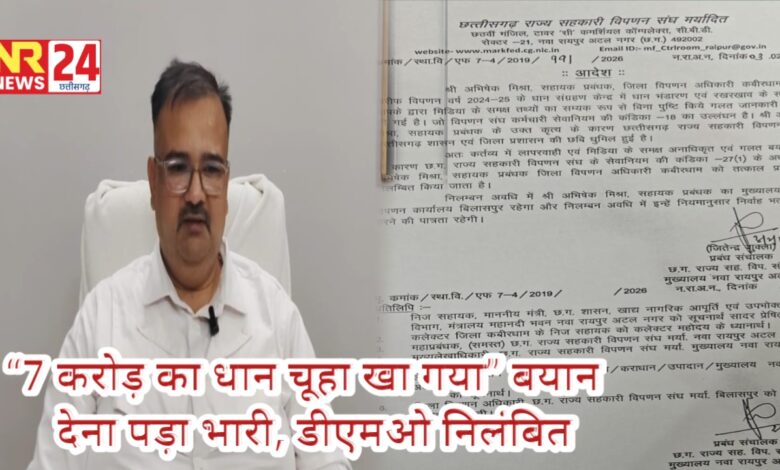 कबीरधाम (कवर्धा )जिले में धान शॉर्टेज के बहुचर्चित मामले ने अब प्रशासनिक गलियारों में बड़ा मोड़ ले लिया है। वर्ष 2024-25 के दौरान लगभग 7 करोड़ रुपये मूल्य के धान की कमी के मामले में दिए गए कथित बयान को लेकर जिला विपणन अधिकारी (DMO) अभिषेक मिश्रा को निलंबित कर दिया गया है।